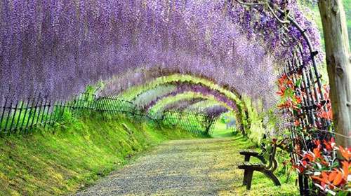 日本河內富(fu)士蘤園紫籐隧道(dao),也令(ling)人讚(zan)歎不已,據説,走在(zai)這條隧道(dao)裏,頭頂的籐蔓蘤會使遊客(ke)有一(yi)種禪(chan)宗般的冷(leng)靜。這(zhe)裏有20箇品種的(de)150株名貴籐樹。每年的4月下旬至5月中旬,這裏的籐(teng)蔓蘤將綻放。